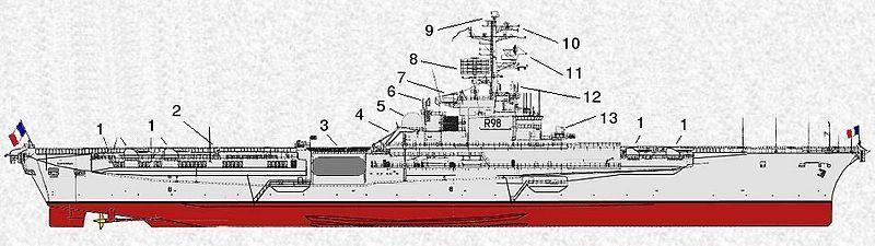 Clemenceau and Foch were modernized during September 1977 – November 1978 and July 1980 – August 1981 (Foch). This mid-life upgrade cleared them for the new Super Étendard (along with several other upgrades, like the SENIT C3 system). Then they had up to 40 aircraft: 10 F-8FN, 15–16 Super Étendard and 3–4 Étendard IVP, 7 Alizé, 2 Super Frelon and 2 Alouette III. Their hangar measured 152 × 24 × 7 meters (3,648 square meters). Clemenceau's fuel depots were 1,200 mc (JP5) and 400 mc (AVGAS). Foch increased this amount up to 1,800 and 109 respectively.[6]