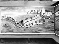Hunter's largest work is a series of murals in the African House at Melrose Plantation. Built the early 19th century by enslaved people at Melrose Plantation, the African House is a Creole hybridization of various African, French, Native American building traditions.[18][19][20] However, little is known about its construction and early uses, however it is known that it served as a storehouse and during Cammie Henry's ownership as a residence for artists.[21] In 1949, Clementine Hunter's first show in the Cane River Valley was hosted by Mignon in the upstairs area of the African House.[11]Hunter painted Murals in the Yucca house and the main Melrose Plantation house.[6][7] In 1955, Hunter and François Mignon collaborated to produce the series of paneled murals that depict the history of the Cane River Valley and reflect the artist's life.[7] The mural consists of nine rectangular panels, each painted in Hunter's home studio.[7] Completed over three months, the murals were finished Hunter was sixty-eight years old.[7]