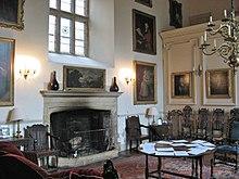 The central and largest room in the house is the great hall which was the original dining room and the accompanying screens passage which gave access to the hall from the service rooms. The staircase to the north of the hall was added in the 18th century. The state room on the western side of the first floor was damaged by fire in 1882; the oak panelling around the fireplace was brought from the Eltons' former house in Queen Square, Bristol. The chapel on the first floor has a rectangular window with reticulated tracery, which dominates the front of the house. The stained glass in the window was added after the 1882 fire.[33] The justice room has had a variety of uses but takes its name from its function as the manorial court until the 18th century.[34] The house contains many family portraits and other pictures as well as collections of Eltonware and Nailsea Glass and prints of bridges and railways.[35][36]