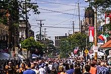 Running east from Public Square through University Circle is Euclid Avenue, which was known for its prestige and elegance as a residential street. In the late 1880s, writer Bayard Taylor described it as "the most beautiful street in the world".[93] Known as "Millionaires' Row", Euclid Avenue was world-renowned as the home of such major figures as John D. Rockefeller, Mark Hanna, and John Hay.[94][95][96]