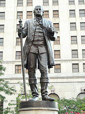 The village served as an important supply post for the U.S. during the Battle of Lake Erie in the War of 1812.[16] Locals adopted Commodore Oliver Hazard Perry as a civic hero and erected a monument in his honor decades later.[17] The Village of Cleaveland was incorporated on December 23, 1814.[18] In spite of the nearby swampy lowlands and harsh winters, the town's waterfront location proved to be an advantage, giving it access to Great Lakes trade. It grew rapidly after the 1832 completion of the Ohio and Erie Canal. This key link between the Ohio River and the Great Lakes connected it to the Atlantic Ocean via the Erie Canal and Hudson River, and later via the Saint Lawrence Seaway. Its products could reach markets on the Gulf of Mexico via the Mississippi River. The town's growth continued with added railroad links.[19]