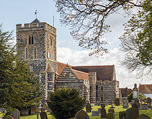 The Grade I listed St Helen's Church at Cliffe was built about 1260 [2] and was constructed in the local style of alternating layers of Kent ragstone and squared black flint. It is one of the largest parish churches in Kent, and the only one dedicated to St Helen, the size of the church revealing its past importance. It contains wall paintings of the martyrdom of St. Edmund, a Jacobean pulpit, and fine stone carvings.[3]
