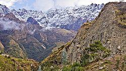 The chain of mountains called the Andes, comprising 34 percent of the national territory, runs the length of Peru, a narrow 80 kilometres (50 mi) wide at the Ecuadorian border in the north and 350 kilometres (220 mi) wide in the south along the border with Bolivia. The Andes, with elevations almost entirely above 2,000 metres (6,600 ft) and mostly above 3,000 metres (9,800 ft), rise above the desert to the west and the tropical rain forest to the east.[16] The mountain climates are cool, often cold, with varied precipitation depending upon exposure. In general the western slopes of the Andres, facing the Pacific Ocean, are drier than the eastern slopes. Beginning at latitude 8.64° S and continuing southward are many snow-capped and glaciated peaks more that 5,000 metres (16,000 ft) in elevation. Thirty-seven mountain peaks in Peru rise to more than 6,000 metres (20,000 ft) in elevation.[17][18]