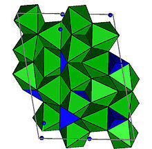 The structure is monoclinic with space group P21/b (a-unique). The unit cell has a = 4.7488 Å; b = 10.2875 Å; c = 13.6967 Å; and alpha = 100.63°; V = 667.65 Å3; Z = 2 for pure Mg hydroxyl-clinohumite.[13] The odd setting of space group P21/c is chosen to preserve the a and b axes of olivine. The structure is closely related to that of olivine as well as the other humite minerals. Mg and Fe are in octahedral coordination with oxygen and silicon (Si) is in tetrahedral coordination. There are five distinct octahedral sites and two different tetrahedral sites. One of the octahedral sites is bonded to two OH,F atoms and is the site where Ti is partitioned.[14] Clinohumite is a nesosilicate with no oxygen atoms shared between two silicons.
