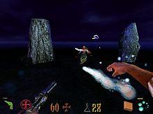 The gameplay of Undying in general follows the precepts of the first-person shooter genre. The game simulates the main character Patrick Galloway's point of view for the player, who uses a variety of weapons to defeat enemies within the game while progressing through a series of levels. As with most FPSs, Galloway has a certain amount of health, represented by a cross symbol and corresponding number at the bottom center-left of the screen. Each time the player is hurt by an enemy the health number is continually reduced until it reaches zero, at which point Galloway dies - an event which is usually marked by a third-person cut scene, unique to each enemy type, showing his gruesome final moments. To prevent this, health can be replenished when low using health packs. Galloway's maximum health can also be increased when using the alternate mode of a certain weapon, but it drains quickly back to the standard amount of health.