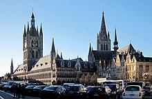 The Cloth Hall (Dutch: Lakenhal/Lakenhalle) is a large cloth hall, a medieval commercial building, in Ypres, Belgium. It was one of the largest commercial buildings of the Middle Ages, when it served as the main market and warehouse for the Flemish city's prosperous cloth industry. The original structure, erected mainly in the 13th century and completed 1304, lay in ruins after artillery fire devastated Ypres in World War I. Between 1933 and 1967, the hall was meticulously reconstructed to its prewar condition, under the guidance of architects J. Coomans and P. A. Pauwels. At 125 metres (410 ft) in breadth, with a 70 metres (230 ft)-high belfry tower, the Cloth Hall recalls the importance and wealth of the medieval trade city. The building now houses the In Flanders Fields Museum.