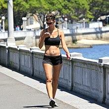 A woman wearing sports bra and boyshorts, which were conventionally women's sportswear but are now also worn as casuals or athleisure by women in the West.