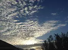 Stratocumuliform genus-types (cirrocumulus, altocumulus, and stratocumulus) that appear in mostly stable air with limited convection have two species each. The stratiformis species normally occur in extensive sheets or in smaller patches where there is only minimal convective activity.[77] Clouds of the lenticularis species tend to have lens-like shapes tapered at the ends. They are most commonly seen as orographic mountain-wave clouds, but can occur anywhere in the troposphere where there is strong wind shear combined with sufficient airmass stability to maintain a generally flat cloud structure. These two species can be found in the high, middle, or low levels of the troposphere depending on the stratocumuliform genus or genera present at any given time.[61][73][76]