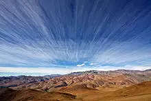 High clouds form at altitudes of 3,000 to 7,600 m (10,000 to 25,000 ft) in the polar regions, 5,000 to 12,200 m (16,500 to 40,000 ft) in the temperate regions, and 6,100 to 18,300 m (20,000 to 60,000 ft) in the tropics.[4] All cirriform clouds are classified as high, thus constitute a single genus cirrus (Ci). Stratocumuliform and stratiform clouds in the high altitude range carry the prefix cirro-, yielding the respective genus names cirrocumulus (Cc) and cirrostratus (Cs). If limited-resolution satellite images of high clouds are analysed without supporting data from direct human observations, distinguishing between individual forms or genus types becomes impossible, and they are collectively identified as high-type (or informally as cirrus-type, though not all high clouds are of the cirrus form or genus).[42]