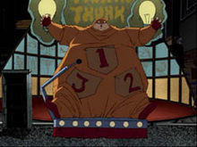 - A considerably different version of the Cluemaster has appeared on the animated series The Batman voiced by Glenn Shadix as an adult and by Kath Soucie as a child. He first appears in the episode "Q & A", in which he is an insane, obese genius with a severe case of inferiority complex and Peter Pan Syndrome who seeks revenge on the people he blames for ruining his long champion-run on Think Thank Thunk. He once a smug but brilliant child prodigy with a very promising future, winning various competitions and also showing great business acumen when he invented a midget football league. Due to his early success and mother spoiling him, Arthur became very self-entitled and obsessed with not only proving himself smarter than anyone, but that he knows everything humanly possible. This nature made him become very immature and irrational, as once he lost after a twelve-week run, he broke down in childish tantrum. After his mother failed to sue the people he blamed for his loss, claiming the game was rigged, Arthur dropped out of school and secluded himself in his mother's home where spent the next twenty years planning his revenge and eating his 'reward' of a lifetime supply of Kremelo chocolate bars, leaving him so obese that even a direct kick to the chest from Batman does nothing to him. In his debut episode, Cluemaster attempts to take his revenge on Herbert Ziegler, Ross Darren, and Yelena Kliminov, the latter being his rival, who had beaten him. After humiliating them in public, his midget henchmen kidnap them one by one and Cluemaster places them on a patently unfair parody of Think Thank Thunk where a loss means death in a large tub of acid. Batman manages to save them by tracking down Cluemaster's lair and goading him into playing a bonus round of "all or nothing". He stumps the Cluemaster with the one question he does not know: the identity of the Batman. Throwing a temper tantrum, the Cluemaster attempts to unmask him but is defeated by Batman just as Cluemaster's mother arrives. Cluemaster later appears in the episode "Rumors", as a captive of the title character, a ruthless vigilante, along with the bulk of Gotham's master criminals. At the episode's end, Batman frees Cluemaster from his imprisonment by Rumor after he was accidentally frozen by Mr. Freeze.