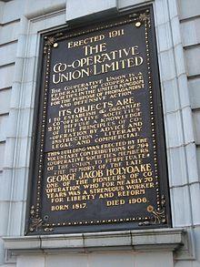 In 1906 the co-operative activist George Jacob Holyoake died and the Co-operative Movement decided that to commemorate him by building a permanent headquarters for the Co-operative Union. The building was designed by architect F. E. L. Harris, who had also designed the nearby CWS building in the year of Holyoake's death. It was erected in 1911[33] on Hanover Street[34] (also home to the Co-operative Bank[35]) and named Holyoake House.[8] A plaque was erected outside the building dedicating the building to Holyoake's memory, reading: