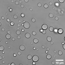 Coacervate (/koʊəˈsɜːrvət/ or /koʊˈæsərveɪt/) is an aqueous phase rich in macromolecules such as synthetic polymers, proteins or nucleic acids. It forms through liquid-liquid phase separation (LLPS), leading to a dense phase in thermodynamic equilibrium with a dilute phase. The dispersed droplets of dense phase are also called coacervates, micro-coacervates or coacervate droplets.These structures draw a lot of interest because they form spontaneously from aqueous mixtures and provide stable compartmentalization without the need of a membrane.