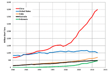 Coal production has grown fastest in Asia, while Europe has declined. Since 2011, world coal production has been stable, with decreases in Europe and USA offset by increases from China, Indonesia and Australia.[13] The top coal mining nations are: