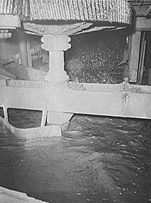 Raw coal often contains impurities such as slate, sulphur, ash (or "bone"), clay, or soil, which requires that it be cleaned before shipment to market.[2][8] Mine workers sampled the coal as it came out of the mine to determine whether the level of impurity recommended washing (if washing was available).[2][8] Slate, sulphur, and ash have a higher relative density than coal, and will sink in agitated water.[2][8] Passing the coal through the tipple was an essential pre-treatment process for coal washing, however, because the impure coal must be of similar sized lumps for coal washing to work.[2][3] If coal washing was conducted, coal might enter the breaker "wet". This meant the incline of the various belts and conveyors had to be lowered so that the coal did not slide on the belts or move too quickly down chutes.[2][8] Where coal washing was used, the coal breaker was expanded to handle both "dry" and "wet" coal simultaneously.[2][8]