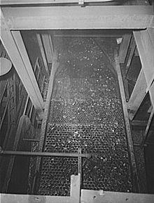 The first function of a coal breaker is to break coal into pieces and sort these pieces into categories of nearly uniform size, a process known as breaking.[1][2] The second function of a coal breaker is to remove impurities (such as slate or rock), and then grade the coal on the basis of the percent of impurities remaining.[2] The sorting by size is particularly important for anthracite coal. In order to burn efficiently, air must flow evenly around anthracite. Subsequently, most anthracite coal is sold in uniform sizes. In the 1910s, there were six commercial sizes of coal (with the smallest size having three subsets):[2][3][4][8]