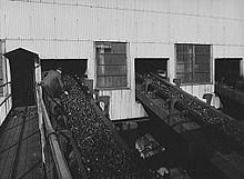 The modern coal breaker can be traced to 1844.[4] Joseph Battin, a supervisor at a coal gas manufacturing plant in Philadelphia, Pennsylvania, invented the first coal breaker—two cast iron rollers (one with teeth, one with holes to accept the teeth) through which the coal was crushed before it rolled down a chute and then through an inclined cylindrical screen.[9] The screen had a mesh which was fine toward the front and became progressively less so toward the end.[4] Larger chunks of coal, falling inside the cylinder as it rotated, broke up and eventually passed through the screen.[4][9] Impurities, which were heavier, tended to exit the breaker at the end of the screen.[4] The sorted coal would then be collected in bins below the screen, and transported to market.[9] A fellow Pennsylvanian, Gideon Bast, licensed the technology from Battin, and erected the first commercial coal breaker in Schuylkill County, Pennsylvania, on February 28, 1844.[4][9] A number of coal processing machines—such as rollers, crushers, washers, and screens—were developed in Europe and later utilized in the United States.[1] By 1866, the coal breaker in the United States had taken the form most recognized today, with multiple stories and numerous screening processes and mechanical sorting devices.[14] The first steam-powered shaking screens were used in the U.S. 1890, and the first steam-powered coal washers installed in 1892.[1]