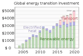 Based on REN21's 2017 report, renewables contributed 19.3% to humans' global energy consumption and 24.5% to their generation of electricity in 2015 and 2016, respectively. This energy consumption is divided as 8.9% coming from traditional biomass, 4.2% as heat energy (modern biomass, geothermal and solar heat), 3.9% from hydroelectricity and the remaining 2.2% is electricity from wind, solar, geothermal, and other forms of biomass. Worldwide investments in renewable technologies amounted to more than US$286 billion in 2015.[65] In 2017, worldwide investments in renewable energy amounted to US$279.8 billion with China accounting for US$126.6 billion or 45% of the global investments, the United States for US$40.5 billion and Europe for US$40.9 billion.[66] Globally there were an estimated 10.5 million jobs associated with the renewable energy industries, with solar photovoltaics being the largest renewable employer.[67] Renewable energy systems are rapidly becoming more efficient and cheaper and their share of total energy consumption is increasing.[68] As of 2019, more than two-thirds of worldwide newly installed electricity capacity was renewable.[69] Growth in consumption of coal and oil could end by 2020 due to increased uptake of renewables and natural gas.[70][71][72]
