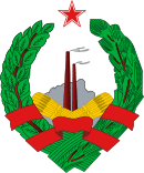 The emblem, along with the flag, of the socialist Republic of Bosnia and Herzegovina was adopted on 31 December 1946. The description of the emblem was similar to the other Yugoslav republics. The device had two crossing stems of wheat in front of scheme of a neighbourhood with two factory chimneys out of which there is smoke. Around the decorative branches and wheat, there is a red track that spirals around. At the top of the emblem is a red star with a golden frame. The red star symbolizes the socialism and communism of Yugoslavia at the time.