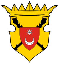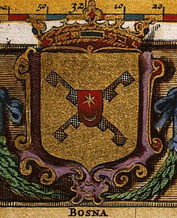 One of the earliest, if not the earliest, coats of arms attributed to Bosnia come from the Fojnica armorial, which was completed in 1340. The Fojnički arms are shown upon a gold shield, two black ragged staffs are crossed in saltire with two Moor's heads surmounting the upper portion of each staff. Overall is a red inescutcheon that was charged with an eight-pointed star and crescent. In the subsequent centuries, European sources would attribute arms to Bosnia that were heavily influenced by this depiction.
