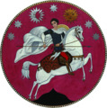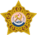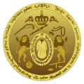 Or, with an image of Saint George Martyr the Victorious in complete armour Azur with a cross on his breast, with a flying cloak Gules, riding a horse Sable in full gallop, the latter covered with a horse cloth Gules, fringed Or, trampling upon a crawling serpent Vert, winged Sable, eyed and tongued Gules, whose head is pierced by the saint's spear Gules.