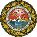 The State coat of arms of Georgia is a heraldic shield, on its purpure field is depicted a silver rider on a silver horse and with a silver spear ending with a golden cross, Saint George with a golden halo, striking a silver dragon. The shield is crowned with the Iverian (Georgian) crown. The supporters are two golden lions, standing on a compartment of stylized grape vine ornament. The compartment is embellished with a silver-purple motto ribbon (face is silver, back is purple). On the silver field of the ribbon with black Mkhedruli letters is written the motto "ძალა ერთობაშია" ("Strength is in unity"). On the ribbon, in the beginning and the end of the inscription, are depicted purpure heraldic crosses.[1]