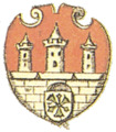 (2) The coat of arms shows on a red escutcheon a white castle with three towers and a closed gate.