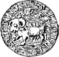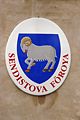 On 1 April 2004, the Prime Minister's Office announced that from then on that it would use a new version of the coat of arms.[1] This new interpretation was based on the original found depicted on the chairs from Kirkjubøur. The colours were inspired from the Faroese flag Merkið, and golden yellow was added. The new coat of arms depicts a ram on a blue shield ready to defend.[1] It can be used by Cabinet Ministries and by official Faroese representatives, though some still use the old symbol.