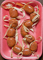 Cojutepeque is known in El Salvador for various sausages or chorizos, especially the Chorizos de Cojutepeque. These chorizos are typically tied with corn husks between the links. The chorizos are shipped to other parts of the country and sold. The example on the left is made with pork, beef, iodized salt, and additives (soy protein, sodium nitrate, sodium benzoate, achiote, herbs, and spices).