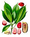 The fruits are rough, mottled and up to 8 inches (20 cm) long and contain large, flat and bright red coloured seeds, commonly known as kola nuts.[2] The seed contains 1.25 - 2.4% caffeine, and can be chewed or ground into a powder added to beverages to increase alertness, diminish fatigue, and increase stamina.[1]