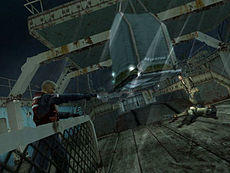 The first half of the game is set on a whaler in the middle of a storm, and the conditions on the deck affect the degree of control the player has over Hansen. As the ship sways continuously from side to side, aiming is made more difficult, although Hansen can grab onto a ledge to steady himself, if one is available.[12] In some instances, the ship can sway to such a degree that Hansen will slide towards the edge and potentially fall overboard. There are also numerous environmental hazards on the deck which react to the motion of the ship, such as swinging electrical wires and crates hooked up to ropes. If any of these items hit Hansen, he will lose health. Waves crashing on to the ship's deck can also cause Hansen damage.[13]