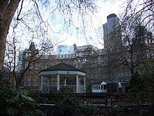 Despite the bustle of business, the ward also contains the City’s "finest oasis of calm",[15] Finsbury Circus, an elliptical square with its own bowling club, is located within the ward, as is Moorgate station.[16]