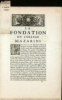 The Collège des Quatre-Nations ("College of the Four Nations"), also known as the Collège Mazarin after its founder, was one of the colleges of the historic University of Paris. It was founded through a bequest by the Cardinal Mazarin. At his death in 1661, he also bequeathed his library, the Bibliothèque Mazarine, which he had opened to scholars since 1643, to the Collège des Quatre-Nations.