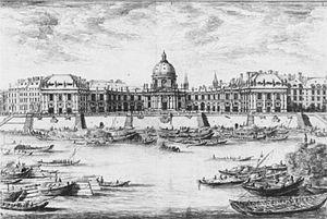 Jean-Baptiste Colbert, who was one of five executors of Mazarin's estate, contrived to get the college built, appointing Louis Le Vau as the architect. Le Vau, who at the time was also working on the south wing of the Cour Carrée of the Palais du Louvre (facing the River Seine), proposed that the college be placed directly across the river on the Left Bank, so that the sovereign (Louis XIV) would have a fine view of it from his future apartments. The site was available because of the planned demolition of the Tour de Nesle and adjacent moat and wall of Philippe Auguste. Le Vau's quickly drawn plans were pronounced "fort beau" ("quite beautiful") by the king, and construction began in 1662 and continued up to Le Vau's death in 1670, when it was taken over by his draftsman, François d'Orbay. The college opened in 1688. In accordance with Mazarin's will, his tomb is in the college chapel.[2]