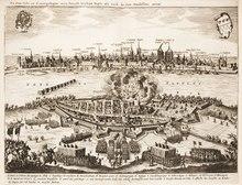 Cologne was designated as one of the Fortresses of the German Confederation.[12] It was turned into a heavily armed fortress (opposing the French and Belgian fortresses of Verdun and Liège) with two fortified belts surrounding the city, the remains of which can be seen to this day.[13] The military demands on what became Germany's largest fortress presented a significant obstacle to urban development, with forts, bunkers, and wide defensive dugouts completely encircling the city and preventing expansion; this resulted in a very densely built-up area within the city itself.