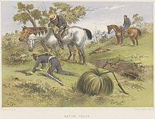 The Queensland Native Mounted Police Force regularly employed native trackers against Indigenous Australians' communities. The force was disbanded in the 1890s after all of the native populations had been subjugated.[30]