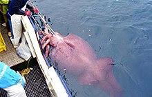 The largest recorded specimen was a female, which are thought to be larger than males, captured in February 2007 by a New Zealand fishing boat in the Ross Sea off of Antarctica.[21] The squid was close to dead when it was captured and subsequently was taken back to New Zealand for scientific study.[32]  The specimen was initially estimated to measure about 10 meters in total length and weigh about 450 kg.[32] The squid turned out to actually weigh 495 kg.[17]