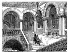 The site was acquired by the Colston Hall Company in 1861, who raised £12,000 in £10 shares.[10] They demolished the old school building in order to build a concert hall. The venue opened on 20 September 1867.[6] The architects were local firm Foster & Wood, working in the Bristol Byzantine style.[11][12] The basement was used as a bonded warehouse handling the cargoes from the docks.[13] The original hall included a coffered barrel-vaulted ceiling, and was modelled after St George's Hall, Liverpool.[14] The foyer building with the grand staircase and smaller hall were opened in 1873.[15] A meeting calling for Women's suffrage was held at the hall in November 1880.[16]