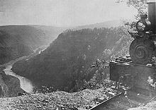 In 1883 the Jersey Shore, Pine Creek and Buffalo Railway opened, following the creek through the gorge. The new railroad used the relatively level route along Pine Creek to link the New York Central Railroad (NYC) to the north with the Clearfield Coalfield to the southwest, and with NYC-allied lines in Williamsport to the southeast.[14] By 1896 the rail line's daily traffic included three passenger trains and 7,000,000 short tons (6,400,000 t) of freight.[9] In the surrounding forests, log drives gave way to logging railroads, which transported lumber to local sawmills. There were 13 companies operating logging railroads along Pine Creek and its tributaries between 1886 and 1921, while the last log drive in the Pine Creek watershed started on Little Pine Creek in 1905.[14] By 1900 the Leetonia logging railroad was extended to the headwaters of Fourmile Run, which has several high waterfalls that prevented logs from being floated down it. In 1903 the line reached Colton Point and Bear Run, which is the northern border of the park today. Lumber on Fourmile Run that had been previously inaccessible was harvested and transported by train, initially to Leonard Harrison's mill at Tiadaghton. When that mill burned in 1905, the lumber went to the Leetonia mill on Cedar Run in Elk Township.[14]