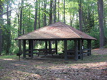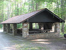 The park has five CCC-built picnic shelters: pavilions 1, 3, and 4 are made of stone and timber with stone fireplaces, while pavilions 2 and 5 each has log columns that support a pyramidal roof. The CCC also built six rustic latrines with clapboard siding and gable roofs, and an underground reservoir that is covered with a low hipped roof. Additional structures constructed by the CCC include three overlooks and a rectangular gable-roofed maintenance building with wane edge siding and exposed rafters made of logs. The structures built by the CCC are noteworthy in that they exemplify the rustic style of construction that was prevalent at national and state parks built during the Great Depression. Workers used locally found, natural materials in construction that blended with the natural surroundings.[9][21] Not all of the CCC's work has survived. A concession stand was built by the CCC and sold food and souvenirs from the late 1930s to at least 1953,[27] but was not listed on the 1986 NRHP nomination form. The CCC also built a brick and stone incinerator, but it is in ruins now.[21]