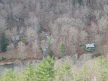 Harrison also built two cabins, named "Wetumka" and "Osocosy", on the west side of Pine Creek, just north of the mouth of Fourmile Run. Sometime after 1903, former Pennsylvania Governor William A. Stone built a cabin named "Heart's-ease" just south of the mouth of Fourmile Run.[14] In 1966 these cabins were still standing and were three of "only four man-made structures inside the canyon proper",[26] but by 1993 only Stone's cabin and one of Harrison's cabins remained.[14] As of 2004, these properties were still owned by the Stone family,[27] and are part of a small parcel of private land within the park.[28]