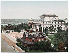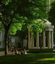 "The Steps", alternatively known as "Low Steps" or the "Urban Beach", are a popular meeting area for Columbia students. The term refers to the long series of granite steps leading from the lower part of campus (South Field) to its upper terrace. With a design inspired by the City Beautiful movement, the steps of Low Library provides Columbia University and Barnard College students, faculty, and staff with a comfortable outdoor platform and space for informal gatherings, events, and ceremonies. McKim's classical facade epitomizes late 19th-century new-classical designs, with its columns and portico marking the entrance to an important structure.[70] On warm days when the weather is favorable, the Low Steps often become a popular gathering place for students to sunbathe, eat lunch, or play frisbee.[71]
