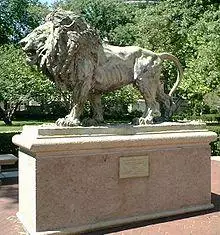 A statue by sculptor Daniel Chester French called Alma Mater is centered on the front steps of Low Memorial Library. McKim, Mead & White invited French to build the sculpture in order to harmonize with the larger composition of the court and library in the center of the campus. Draped in an academic gown, the female figure of Alma Mater wears a crown of laurels and sits on a throne. The scroll-like arms of the throne end in lamps, representing sapientia and doctrina. A book signifying knowledge, balances on her lap, and an owl, the attribute of wisdom, is hidden in the folds of her gown. Her right hand holds a scepter composed of four sprays of wheat, terminating with a crown of King's College which refers to Columbia's origin as a royal charter institution in 1754. A local actress named Mary Lawton was said to have posed for parts of the sculpture. The statue was dedicated on September 23, 1903, as a gift of Mr. & Mrs. Robert Goelet, and was originally covered in golden leaf. During the Columbia University protests of 1968 a bomb damaged the sculpture, but it has since been repaired.[67] The small hidden owl on the sculpture is also the subject of many Columbia legends, the main legend being that the first student in the freshmen class to find the hidden owl on the statue will be valedictorian, and that any subsequent Columbia male who finds it will marry a Barnard student, given that Barnard is a women's college.[68][69]