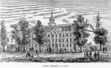 Columbia was established as King's College by royal charter of George II of Great Britain in reaction to the founding of Princeton College.[8] It was renamed Columbia College in 1784 following the American Revolution, and in 1787 was placed under a private board of trustees headed by former students Alexander Hamilton and John Jay. In 1896, the campus was moved to its current location in Morningside Heights and renamed Columbia University.[9][10][11]