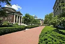 Every Thursday and Sunday of the month, Columbia hosts a greenmarket where local farmers can sell their produce to residents of the city. In addition, from April to November Hodgson's farm, a local New York gardening center, joins the market bringing a large selection of plants and blooming flowers. The market is one of the many operated at different points throughout the city by the non-profit group GrowNYC.[81] Dining services at Columbia spends 36 percent of its food budget on local products, in addition to serving sustainably harvested seafood and fair trade coffee on campus.[82] Columbia has been rated "B+" by the 2011 College Sustainability Report Card for its environmental and sustainability initiatives.[83]
