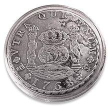 Columnarios are silver coins that were minted by Spain from 1732 to 1773 throughout its new colonies in present-day Ibero America. While the majority of columnarios were struck in Mexico, smaller mints existed in Guatemala; Lima, Peru; Santiago, Chile; Potosí, Bolivia; and Colombia. The base denomination is an 8 reales coin (aka Piece of eight or Spanish dollar). Other minor denominations included 4 reales, 2 reales, 1 real, and 1/2 real. The 8 reales coin is the predecessor to the American dollar. Before the United States Mint was in production, columnarios circulated, along with other coinage, in the US colonies, as legal tender until the middle of the 19th century.