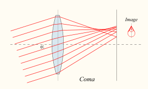 In optics (especially telescopes), the coma (/ˈkoʊmə/), or comatic aberration, in an optical system refers to aberration inherent to certain optical designs or due to imperfection in the lens or other components that results in off-axis point sources such as stars appearing distorted, appearing to have a tail (coma) like a comet. Specifically, coma is defined as a variation in magnification over the entrance pupil. In refractive or diffractive optical systems, especially those imaging a wide spectral range, coma can be a function of wavelength, in which case it is a form of chromatic aberration.