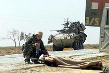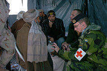 Traditionally, most United States medical personnel also wore a distinguishing red cross, to denote their protection as non-combatants under the Geneva Convention. This practice continued into World War II. However, the enemies faced by professional armies in more recent conflicts are often insurgents who either do not recognize the Geneva Convention or choose not to adhere to it, and thus readily engage all personnel, irrespective of non-combatant status. As their non combatant status is not respected, many US medics no longer wear non combatant markings. This can enable medics to be used as medically trained soldiers, fighting aggressively rather than just in self-defence.[8] Combat Medics in the United States Army and United States Navy Hospital Corpsmen are virtually indistinguishable from regular combat troops, except for the extra medical equipment they carry.