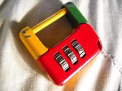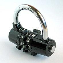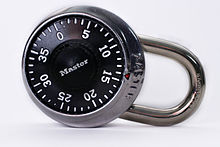 A combination lock is a type of locking device in which a sequence of symbols, usually numbers, is used to open the lock. The sequence may be entered using a single rotating dial which interacts with several discs or cams, by using a set of several rotating discs with inscribed symbols which directly interact with the locking mechanism, or through an electronic or mechanical keypad. Types range from inexpensive three-digit luggage locks to high-security safes. Unlike ordinary padlocks, combination locks do not use keys.