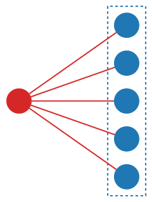 For example, the "species of permutations"[4] maps each finite set A to the set of all permutations of A, and each bijection from A to another set B naturally induces a bijection from the set of all permutations of A to the set of all permutations of B. Similarly, the "species of partitions" can be defined by assigning to each finite set the set of all its partitions, and the "power set species" assigns to each finite set its power set. The adjacent diagram shows a structure on a set of five elements: arcs connect the structure (red) to the elements (blue) from which it is built.