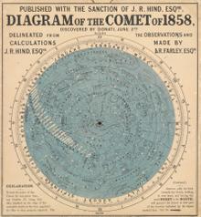It was nearest the Earth on October 10, 1858, and for much of October was a brilliant object with a long, scimitar-like dust tail and prominent gas tail. It remained a naked-eye object until November for Southern Hemisphere observers.[4] The final observation was by William Mann, chief assistant at the Royal Observatory, Cape of Good Hope, who detected it as a faint nebulosity on March 4, 1859.[5]